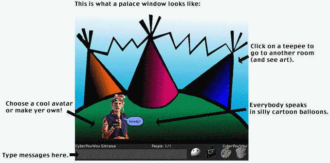 CyberPowWow used The Palace software as our graphical chatspace because it was easy to use and to customize. It featured cartoon-like text balloons, and a happy-face default avatar. Though we at Nation to Nation no longer have the resources to continue supporting The Palace, it is still possible to download it from www.ThePalace.com. If you are reading this on a computer that has The Palace installed, you can check out the fabulous artwork, or stop by the library to read the insightful texts, all made just for CyberPowWow. To move around in a room, use your arrow keys. To go to another room, single-click on the hotspots--exactly like in a web page. The best way to learn how to use the palace is to use it.